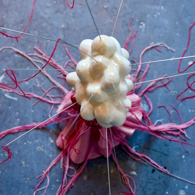 The work 𝘜𝘯𝘳𝘢𝘷𝘦𝘭𝘪𝘯𝘨 explores what it means to be inside out, that vulnerable state where our internal landscape becomes external and our attempts at self-repair and healing are laid out for everyone to see. Each red thread piercing through the needle and into the ceramic form shows the delicate, often painful process of mending ourselves. We reach through our own brokenness with such violent tenderness, knowing how fragile we can become.